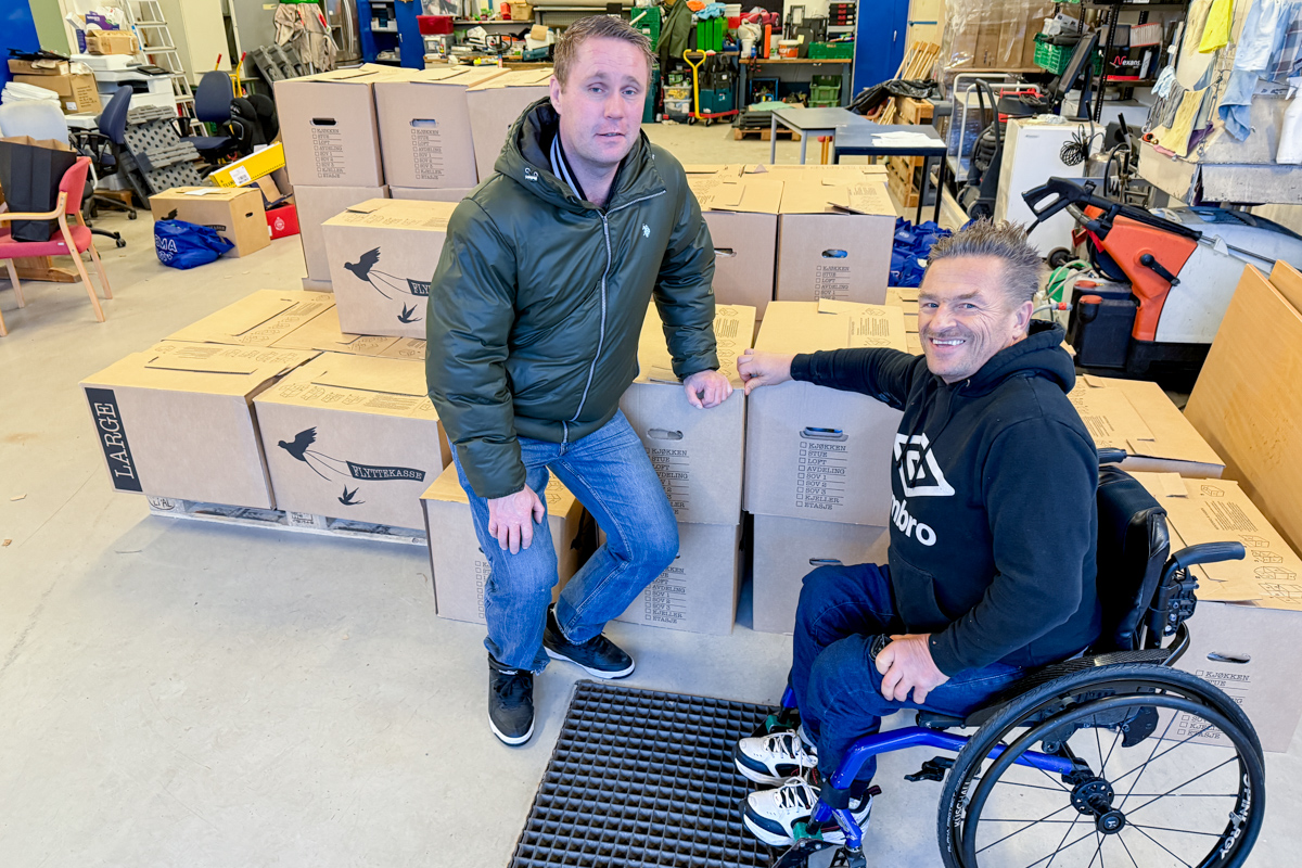 Å få levert alle kassene krever også en innsats. Mange henter selv, men noen trenger også å kassene levert. Trond stiller opp som sjåfør, og siden han selv sitter i rullestol hadde han i år med seg tidgiver Kai som bærehjelp.