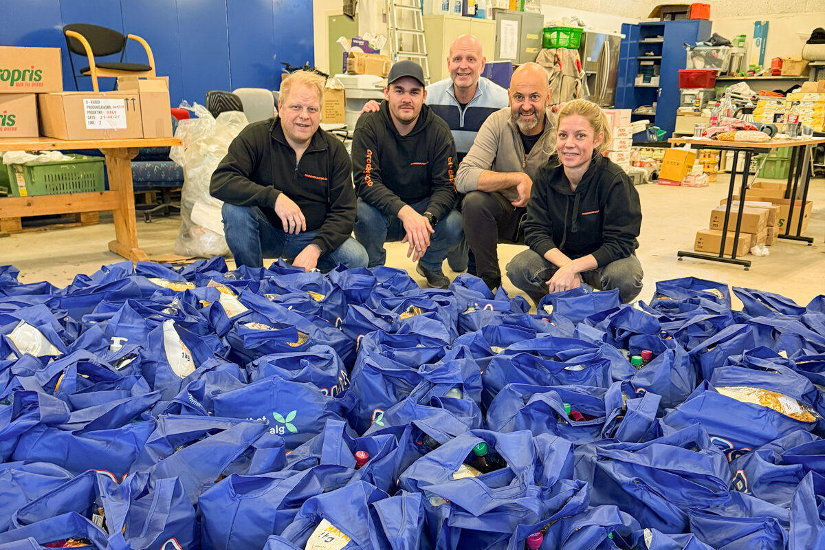 Fem ansatte fra Brødrene Ødegård dukket opp med arbeidsinnsats og et smil om munnen da de pakket en stor del av kassene tidlig i uke 50.